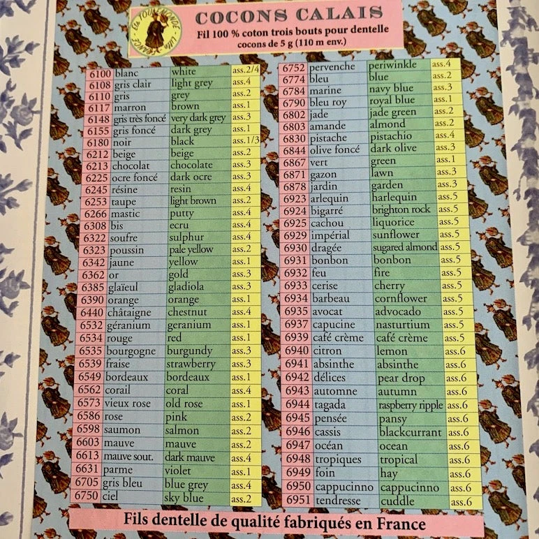 A beautiful assortment of Calais cotton lace thread cocoons from Sajou! These are fabulous for lace-work as well as embroidery. It is named for Calais, as a tribute to the town which is famous for its lace.
