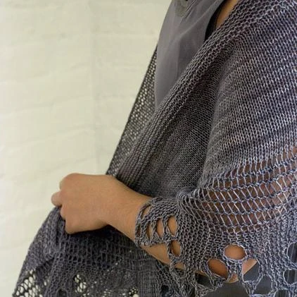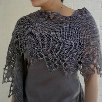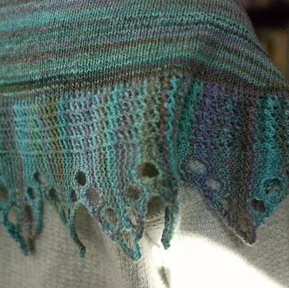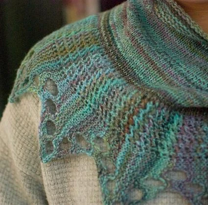 Taking advantage of simple stitch patterns and a border that is worked sideways, the construction of Saranac shows off handspun, and hand-dyed yarns beautifully.