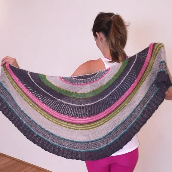 Moon pie is a multi textural wrap with many stitch patterns. Color, texture, and a semi-circular shape give it a beautiful look. Increases are performed in large groups. Moon pie is suited for an intermediate knitter with enough interest for the advanced knitter.