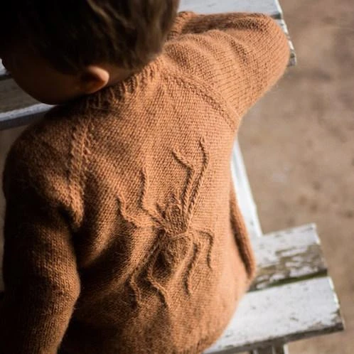 “Spider cardigan ” is a cardigan with a big cool spider on the back. . The pattern is for sizes 3 (4) 5 (6) 7 (8) 9 years. The sample in the photo is knitted in the color Camel Lama uld (6234).