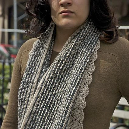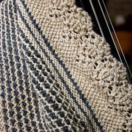 This 2 color cowl is worked in the round. The body – the striped portion – is worked first. The edging is knit flat and knit onto the body of the cowl.