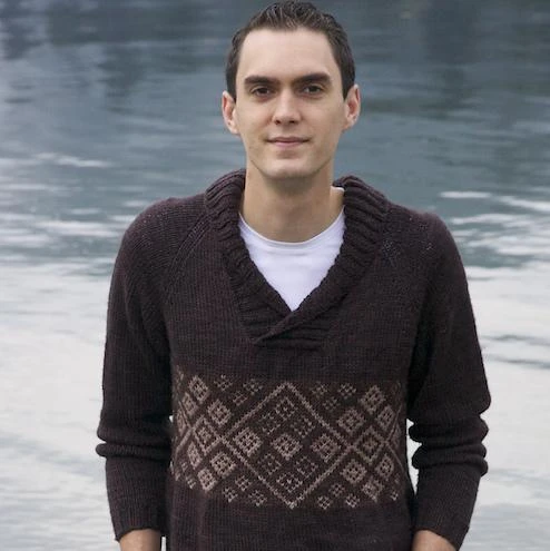 This pullover is knit from the bottom up, in the round. Body and sleeves are knit to underarm, then joined for working the yoke. The shawl collar is picked up and knit last.