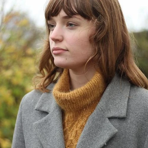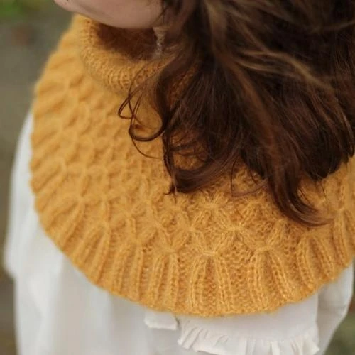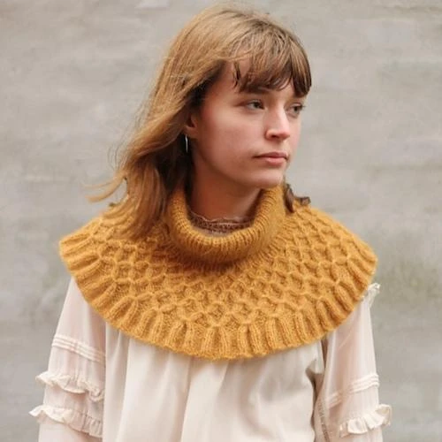 The cowl is work top-down and has a ribbed high neck. You can either knit the cowl in Mĺnestrĺle or