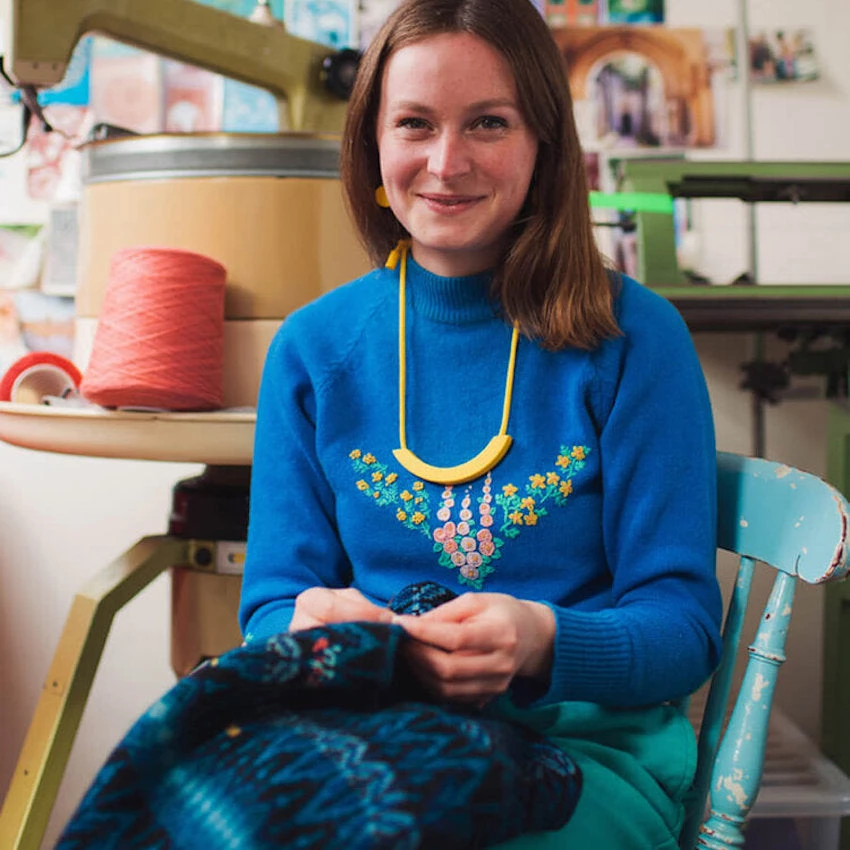 Flora Collingwood- Norris is a knitwear designer, maker and mender based in Galashiels in the Scottish Borders. Having graduated with a textile design degree in 2009, she has worked in various freelance knitwear roles before launching her design studio Collingwood- Norris Designs in 2016.